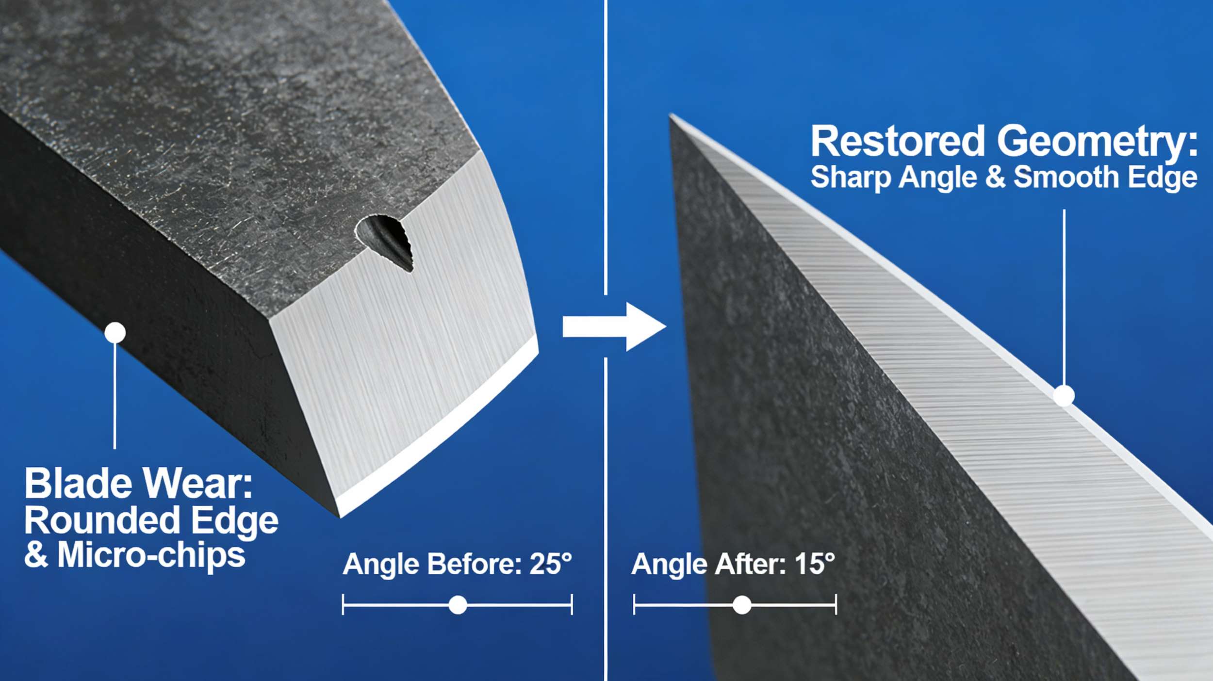 مع مرور الوقت واستخدام الشفرات، تتآكل تدريجياً وتصبح حوافها غير حادة، مما يؤدي إلى زيادة قوة القطع، وظهور نتوءات أكثر على المنتجات، وارتفاع استهلاك الطاقة. لا يقتصر دور الصقل الاحترافي المنتظم على استعادة حدة الشفرات فحسب، بل يشمل أيضاً تصحيح التشوهات الطفيفة، مما يضمن دقة القطع.